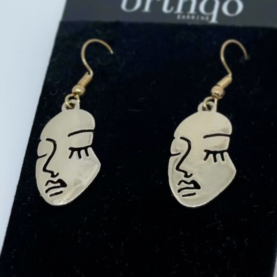 光沢があるゴールドのフックピアス。個性的なフェイスモチーフが揺れる存在感のあるピアスです。